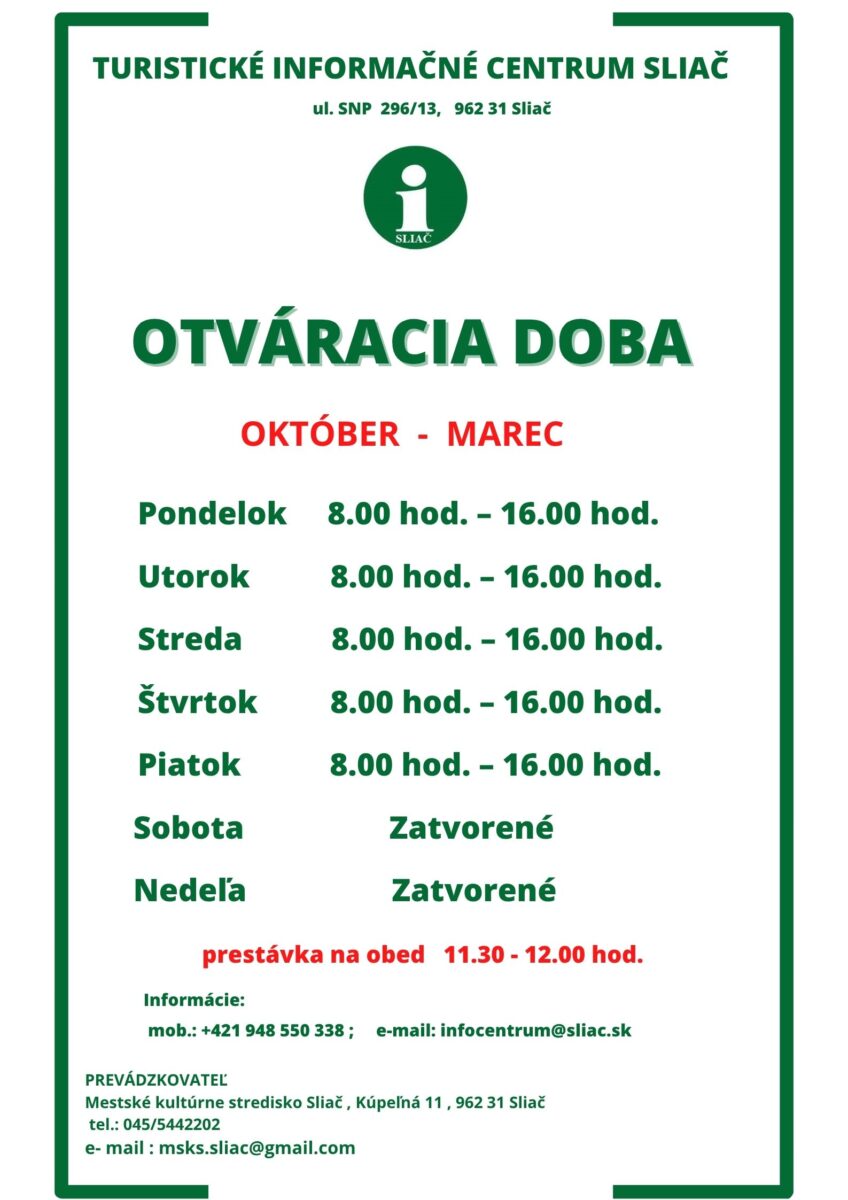 Vítame Vás na stránke TIC mesta Sliač, ktorého hlavnou činnosťou je poskytovanie informácií návštevníkom a občanom mesta Sliač a blízkeho okolia. Naši zamestnanci Vám poskytnú informačný a incomingový servis, ktorý kompletne pokrýva aktivity regiónu, aktuálne informácie o letných a zimných možnostiach trávenia voľného času v blízkom okolí mesta Sliač a kúpeľov Sliač.