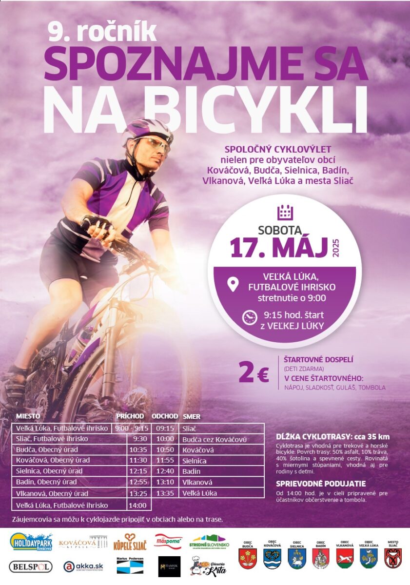 17. mája 2025 začíname registráciou na Veľkej Lúke registráciou od 9.00 hod., postupne sa presunieme na Sliač, odkiaľ bude odchod 9.30 hod smer Budča ….a postupne obídeme Kováčovú, Sielnicu, Badín, Vlkanovú a vrátime sa okolo 14.00 hod na Veľkú Lúku.