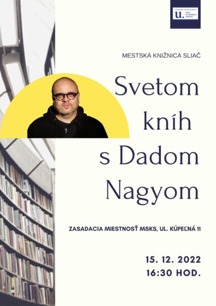 Mestská knižnica Sliač Vás pozýva 15. 12. 2022 o 16:30 hod. do zasadacej miestnosti Mestského kultúrneho strediska, ul. Kúpeľná 11 na besedu – Svetom kníh s Dadom Nagyom.